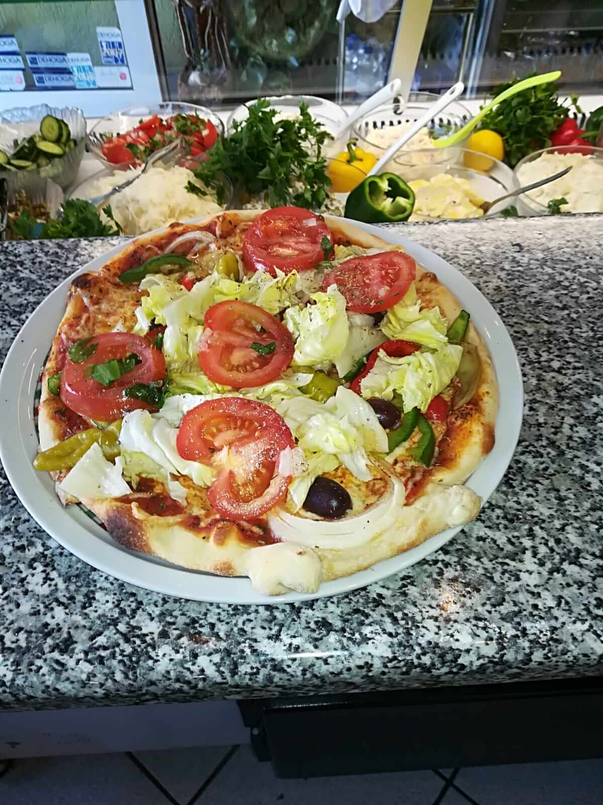 frische Tomatenscheiben, Käse, Paprika, Zwiebeln, Oliven, Peperoni, Kopfsalat